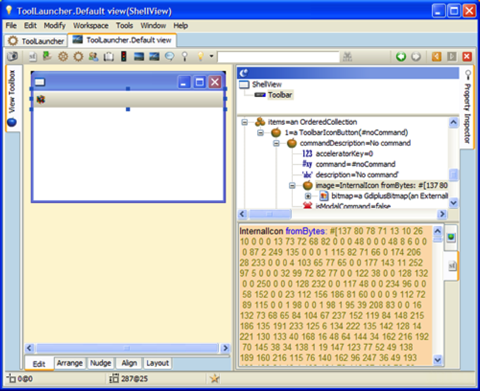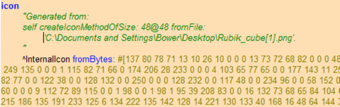 ByteArray, which will be held in the literal frame of the #icon method. In this case the byte array is 4379 bytes which would compare favourably with the size of a 48x48 PNG image file. Typically, though, this will be a lot smaller than the equivalent Windows ICO file which might have several different resolution renditions of the same uncompressed bitmaps within it. Newer Vista-style icons which hold PNG images anyway are more efficient and might come in at about the same size as our byte array.